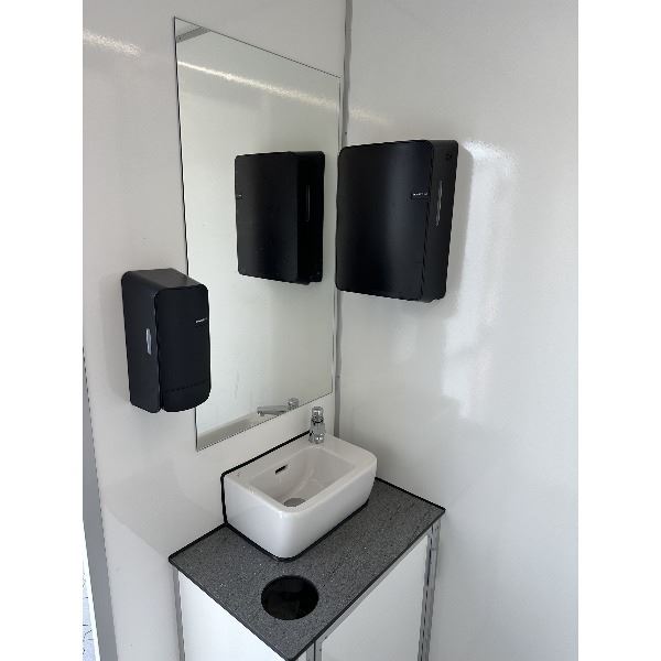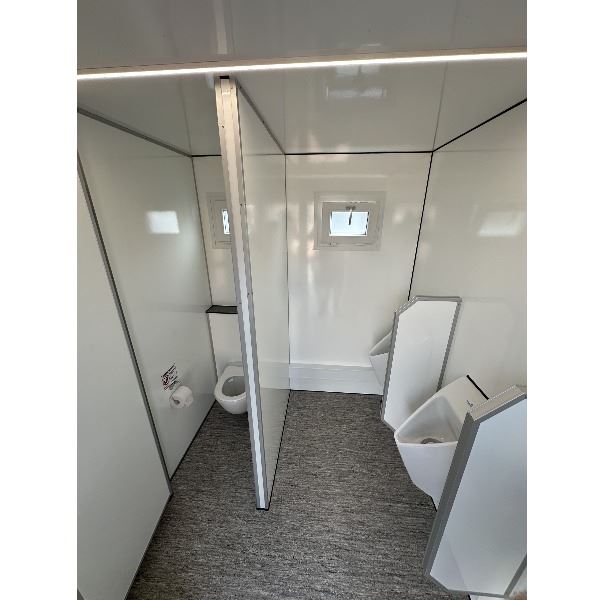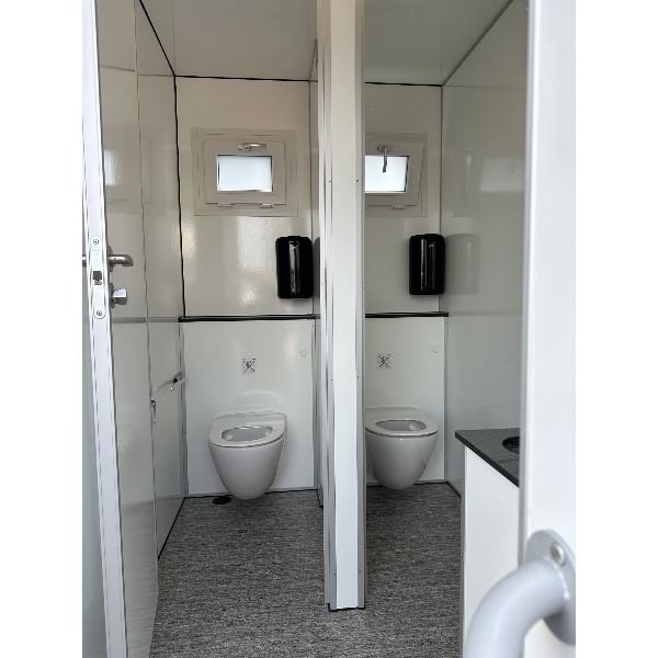 Deze toiletwagen met twee afzonderlijke cabines is ontworpen voor optimaal gebruiksgemak. De damescabine is uitgerust met twee toiletten met doorspoelfunctie, terwijl de herencabine beschikt over twee waterloze urinoirs en een toilet met doorspoelfunctie. Beide cabines zijn voorzien van een wasbak met automatische kraan, spiegel, verlichting, verwarming en ventilatie voor extra comfort.